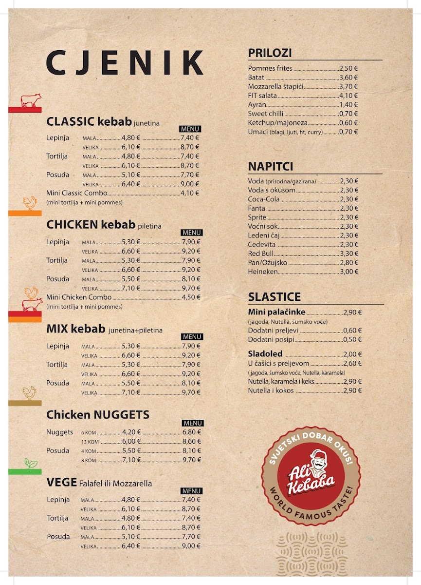 Introducing the menu at Ali Kebaba, located at the heart of Zagreb, offers a fusion of flavors that tantalize the palate. Specializing in kebabs, it presents an array of options designed for both the health-conscious and the flavor-seeker. The Flexiraj Pametno bowl is a standout, combining succulent chicken with fresh veggies and feta, delivering 492 kcal with a protein punch of 41g—perfect for a nutritious meal at €8.50. Meanwhile, the Mix Kebab selection allows customers to customize their experience with juicy chicken and classic beef, either in bowls or deliciously toasted tortillas, starting from just €6.90. Patrons praise the generous portions and swift service, making dining here both satisfying and affordable. Despite some mixed feedback regarding consistency, the vibrant atmosphere and welcoming staff create a delightful culinary journey that makes every visit worthwhile. Come experience the kebab revolution at Ali Kebaba, where every bite tells a story!